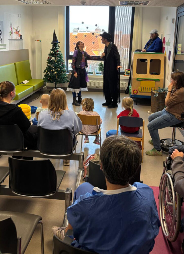 Theater Kiel besucht die Kinderonkologie. Mittwoch 17.12.25 waren einige Ensemble Mitglieder des aktuellen Weihnachtsmärchen „Die kleine Hexe“ zu Gast in der Tagesklinik. Sie spielten einige